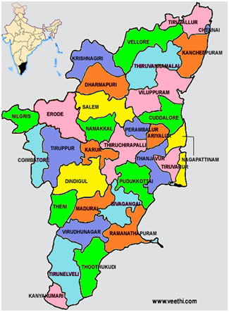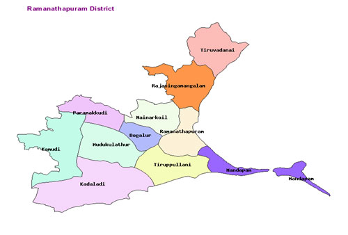 The total population of children under the age of 6 is 7,423,832. A total of 14,438,445 people constituting 20.01 per cent of the total population belonged to Scheduled Castes (SC) and 794,697 people constituting 1.10 per cent of the population belonged to Scheduled tribes (ST). Ramanathapuram District is an administrative district of Tamil Nadu state in southern India. The city of Ramanathapuram is the district headquarters. Ramanthapuram District has an area of 4123 sq km. It is bound by Sivaganga District in the North, Northeast by Pudukkottai District in the Northeast, by the Palk Strait on the East, by the Gulf of Mannar on the South, by Thoothukudi District on the West, and by Virudhunagar District on the Northwest. The district is divided into seven revenue divisions with Ramanathapuram town as its headquarters. It has two municipalities, one township and nine panchayats. Rural Development Programmes of the government are implemented through 11 administrative blocks (Panchayat unions) and 429 village administrative bodies (Panchayats) with 2362 hamlets. Rameswaram a coastal town is a legendary pilgrim center for Hindus. "The waterless forest" as widely known Ramanathapuram district lies in the southeast coastal district of Tamilnadu, India. This goes to say that the district is drought prone for the greatest part of the year. Nature of the land is mostly flat and sandy. Due to lack of irrigation, agriculture depends only on rain water, which is very low and scarce. The three major reservoirs too suffer scarcity of water almost throughout the year. Palmyrah trees which thrive in this climatic condition are the only species found abundantly in this district. Recent days “Karu Odoi/Karu Vela maram” tree variety (Prosopis juliflora) brought to meet the fuel need of the rural people is encroaching most of the areas and adding up to the worst condition still further.